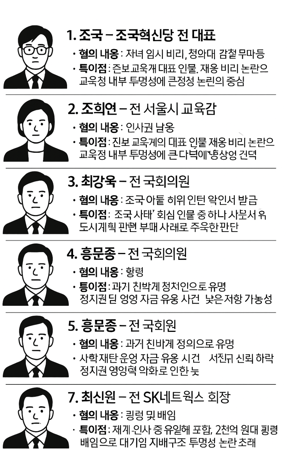 - 특이점: 재계 인사 중 유일하게 포함. 2천억 원대 횡령 배임으로 대기업 지배구조 투명성 논란 초래