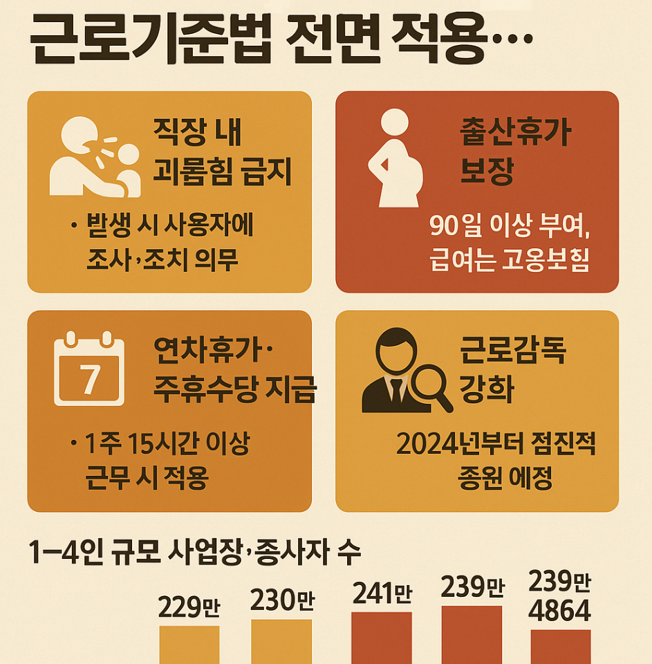 그동안 일부 조항만 적용받던 영세사업장들도 직장 내 괴롭힘 금지, 출산휴가, 주휴수당 지급 의무를 지켜야 합니다.